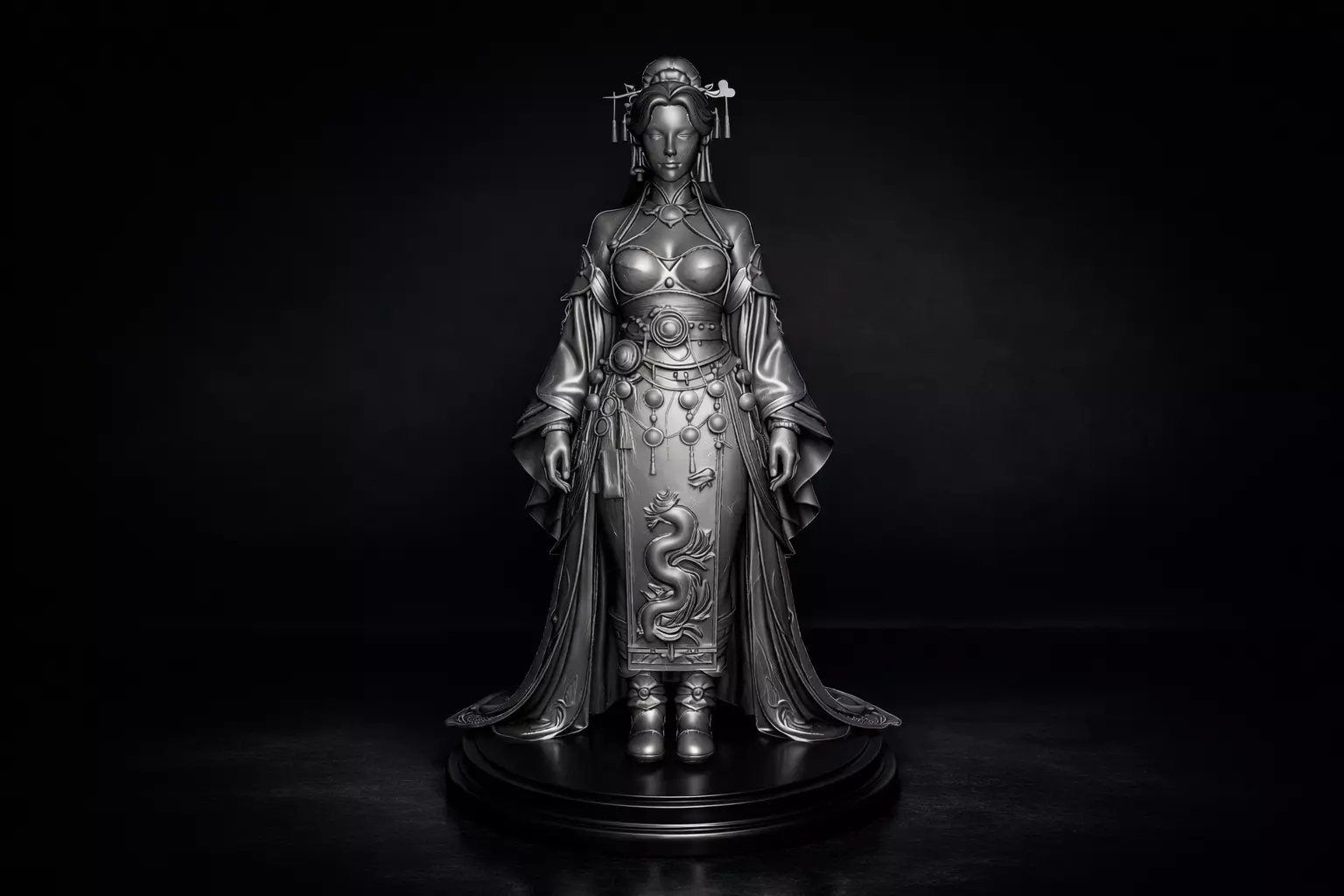Celebrate the spirit of Chinese New Year with this beautifully detailed 3D printed Chinese-inspired lady statue. This elegant female figure is designed with flowing ceremonial robes, delicate ornaments, and a striking dragon motif on the dress, symbolizing luck, strength, and prosperity. The calm posture and refined expression give the sculpture a graceful presence that fits perfectly with Lunar New Year décor, Asian-themed interiors, or collectible art displays.