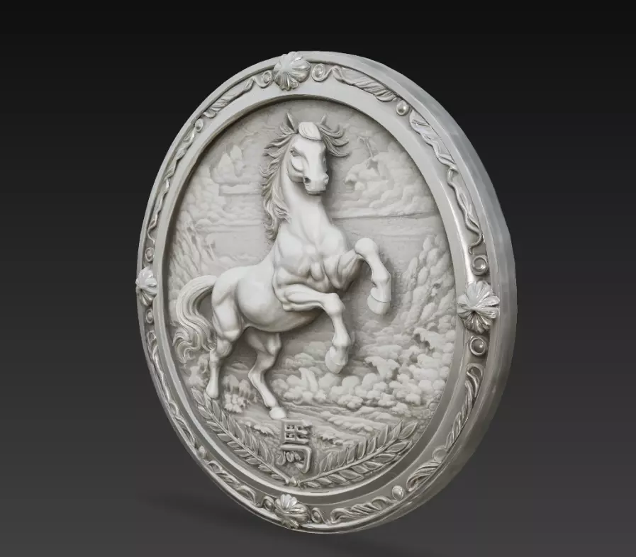 This Chinese Zodiac Horse Coin Relief 3D Model features the horse, one of the twelve animals of the traditional Chinese zodiac calendar. The sculpture is designed as a decorative circular coin-style relief surrounded by elegant ornamental elements.