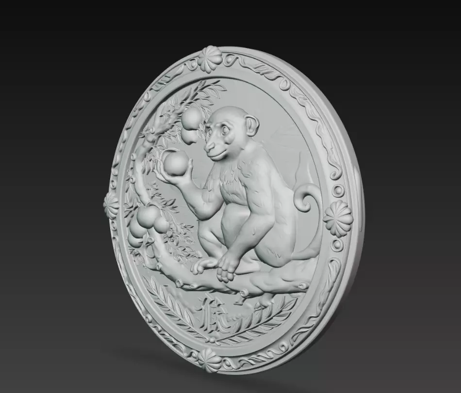 This Chinese Zodiac Monkey Coin Relief 3D Model represents the monkey, one of the twelve animals of the traditional Chinese zodiac. The sculpture is designed as a detailed circular medallion featuring a playful monkey surrounded by natural and ornamental relief elements.