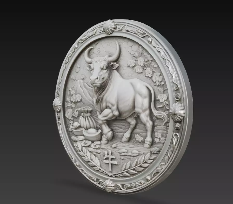 This Chinese Zodiac Ox Coin Relief 3D Model features the ox, the second animal of the traditional Chinese zodiac calendar. The sculpture is designed as a decorative circular coin-style relief surrounded by elegant ornamental elements.