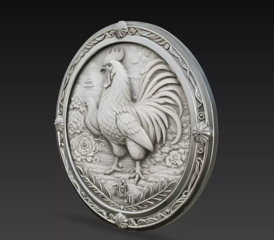 This Chinese Zodiac Rooster Coin Relief 3D Model represents the rooster, one of the twelve animals of the traditional Chinese zodiac. The sculpture is designed as a decorative circular medallion surrounded by ornamental relief elements.