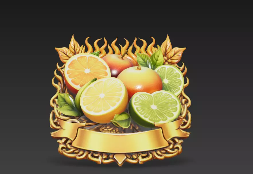 Citrus Royal Emblem 3D Model features a vibrant decorative crest composition showcasing fresh oranges, lemon slices, lime cross-sections, and detailed green leaves framed within an ornate golden heraldic structure.