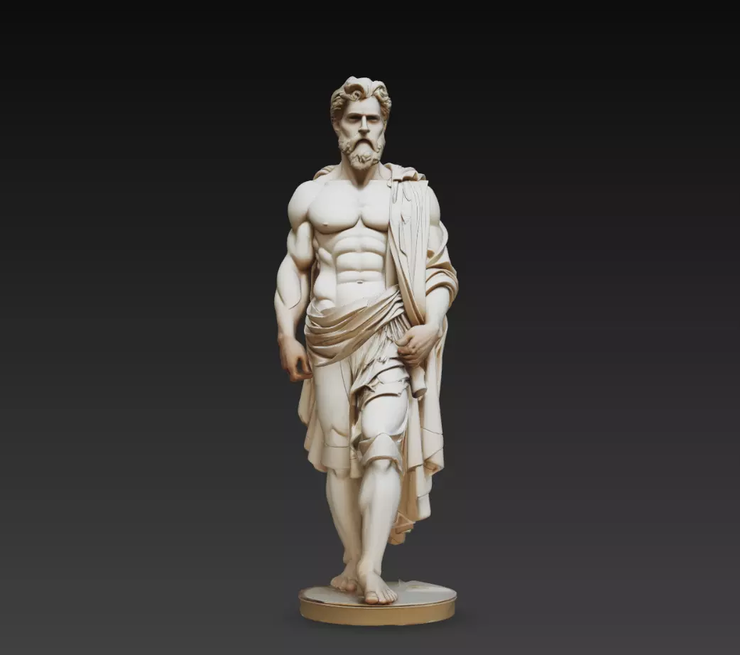 The model features a well-proportioned male figure with detailed musculature and natural body flow. The draped cloth adds movement and elegance, while the calm yet powerful stance reinforces a heroic presence.