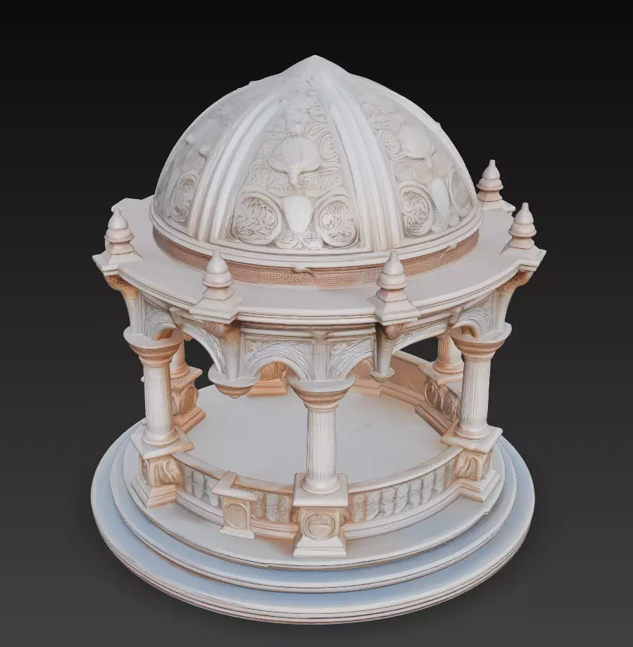 Sculpted with high attention to decorative elements, the model preserves fine engravings, column fluting, dome patterns, and stone-like surface transitions while maintaining clean geometry for professional production use. It performs excellently in high-quality CGI renders and is also suitable for resin 3D printing, where architectural depth and ornamental details are reproduced with high clarity.