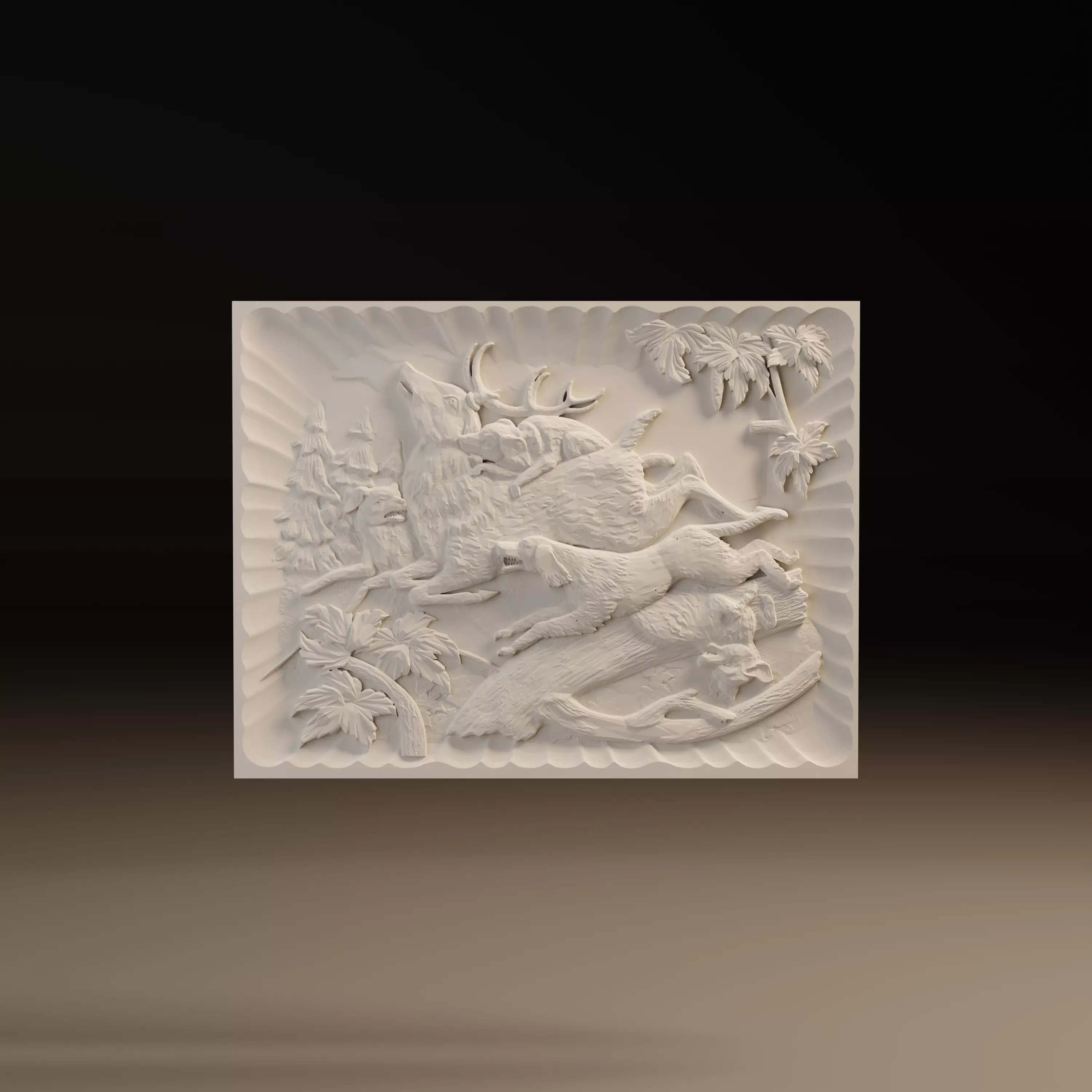 Highly detailed hunting scene bas relief 3D model featuring a deer chased by hunting dogs in a forest environment. The composition includes detailed trees, terrain, and dynamic animal movement making it ideal for hunting lodge decoration, rustic interiors, and woodworking projects.