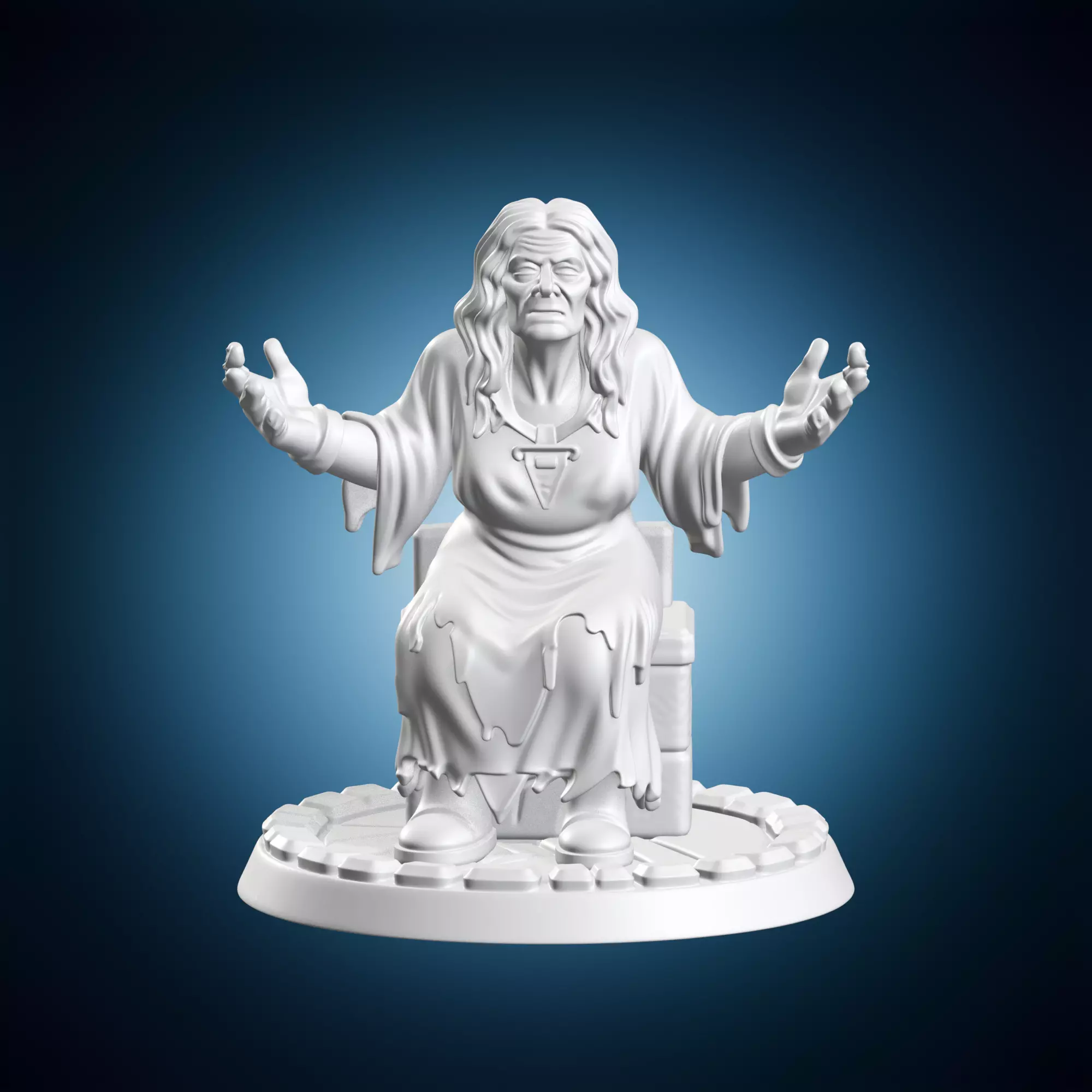 A small figurine of a crone hag sitting on a stool or chair. This miniature sculpture is likely used as part of a larger diorama or scene. The crone hag may be depicted in a realistic or stylized manner, with intricate details and textures. She may be shown wearing a long dress or cloak, and carrying a staff or other object. The figurine is small enough to be displayed on a shelf or desk, making it a great addition to any collection of miniature art. Crone hag figurines are often used in fantasy settings, such as medieval or ancient mythological scenes. They may also be found in modern art collections, where they are appreciated for their unique and imaginative portrayal of an often-overlooked figure.