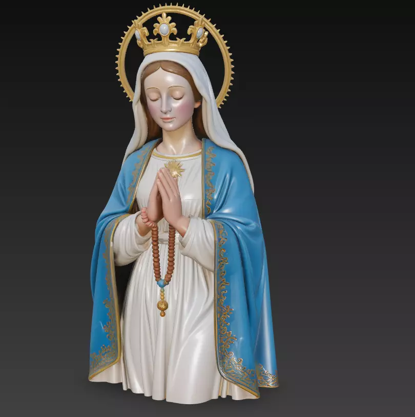 This beautifully crafted 3D sculpture depicts a serene Crowned Praying Madonna, standing in a peaceful pose with hands gently joined in prayer. The figure holds a detailed rosary, while the elegant blue cloak with golden trim flows naturally around her form.