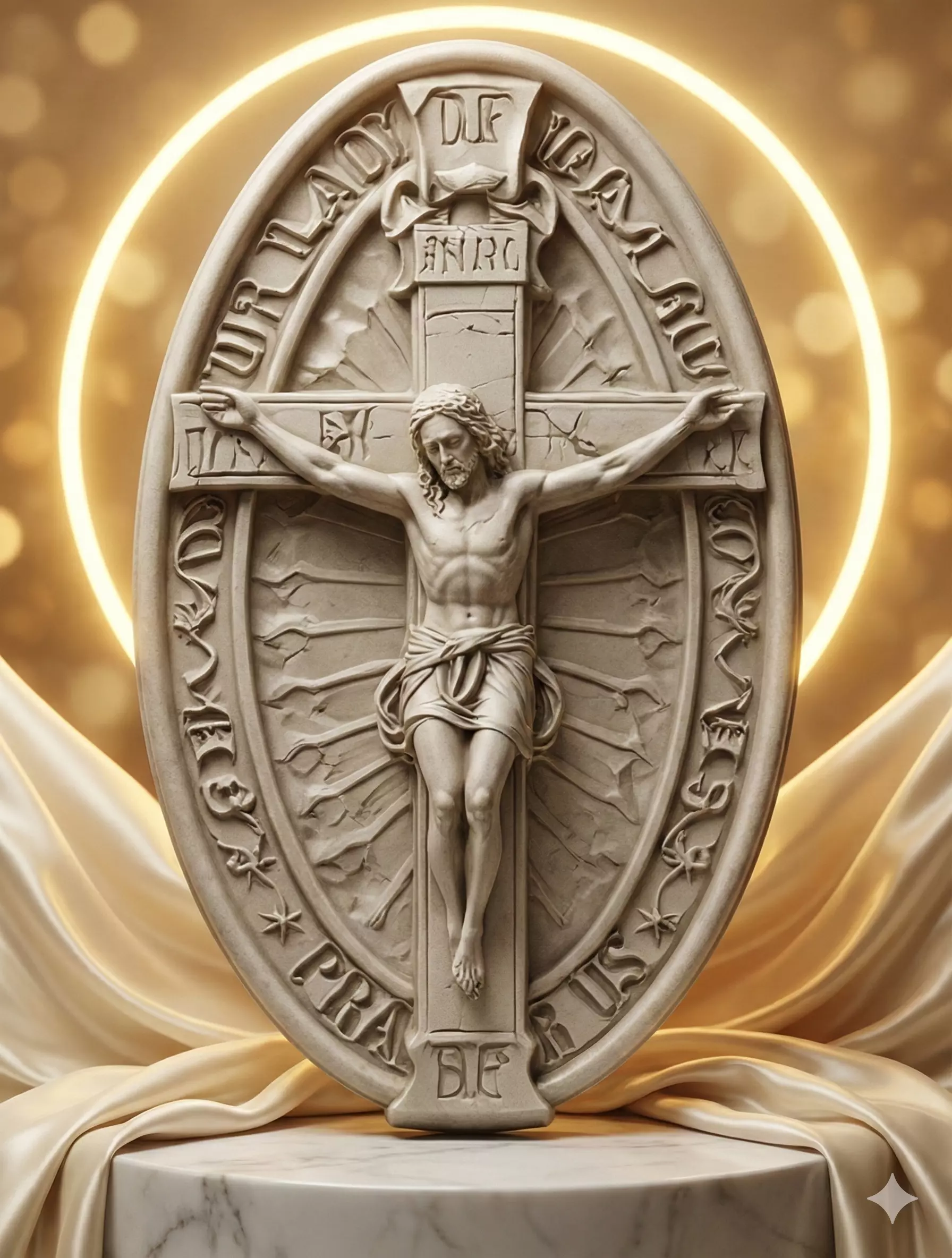 Crucifix scene sculpted in high reliefSymbolic human figure with balanced anatomyDeep layered relief for strong light and shadow contrastOval ornamental frame enhancing durability and balanceIntegrated loop for chain or cord attachment