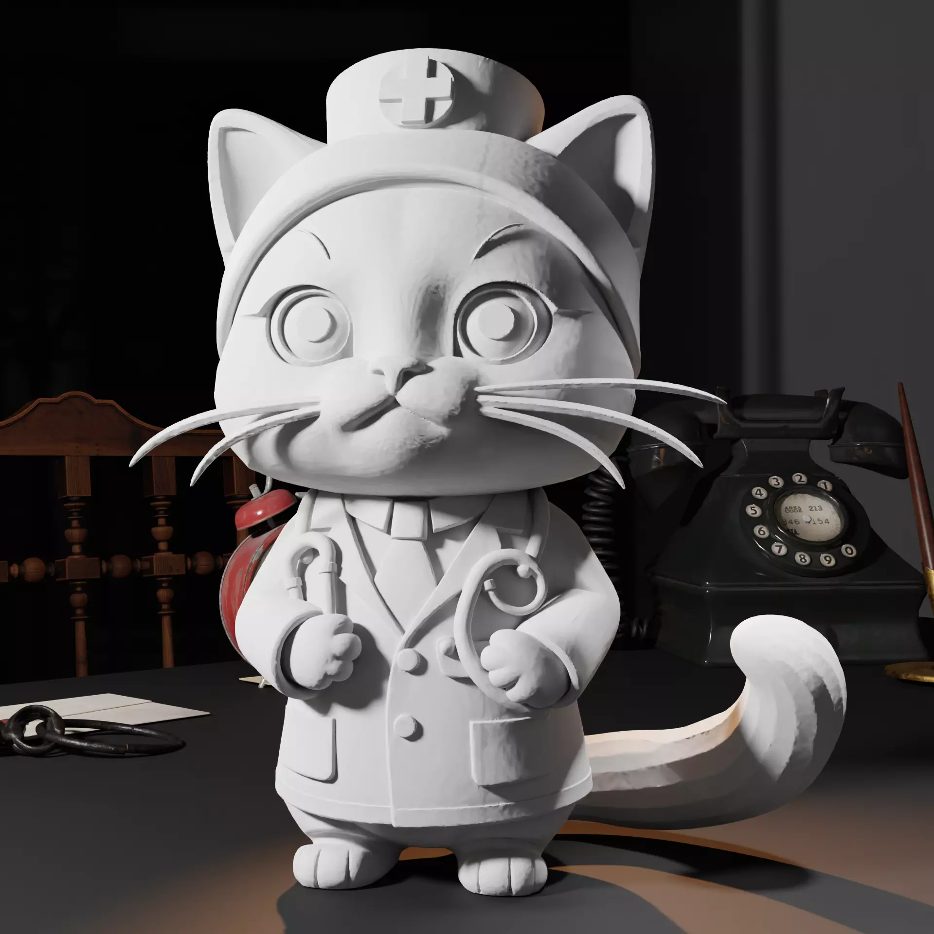 This delightful nurse kitty stands proudly in a classic medical outfit, complete with a nurse cap featuring a cross emblem, a tailored coat with buttons and pocket details, and a stethoscope held confidently in tiny paws. The oversized expressive eyes, rounded cheeks, elegant whiskers, and softly curved tail give the character an irresistible charm that instantly captures attention.