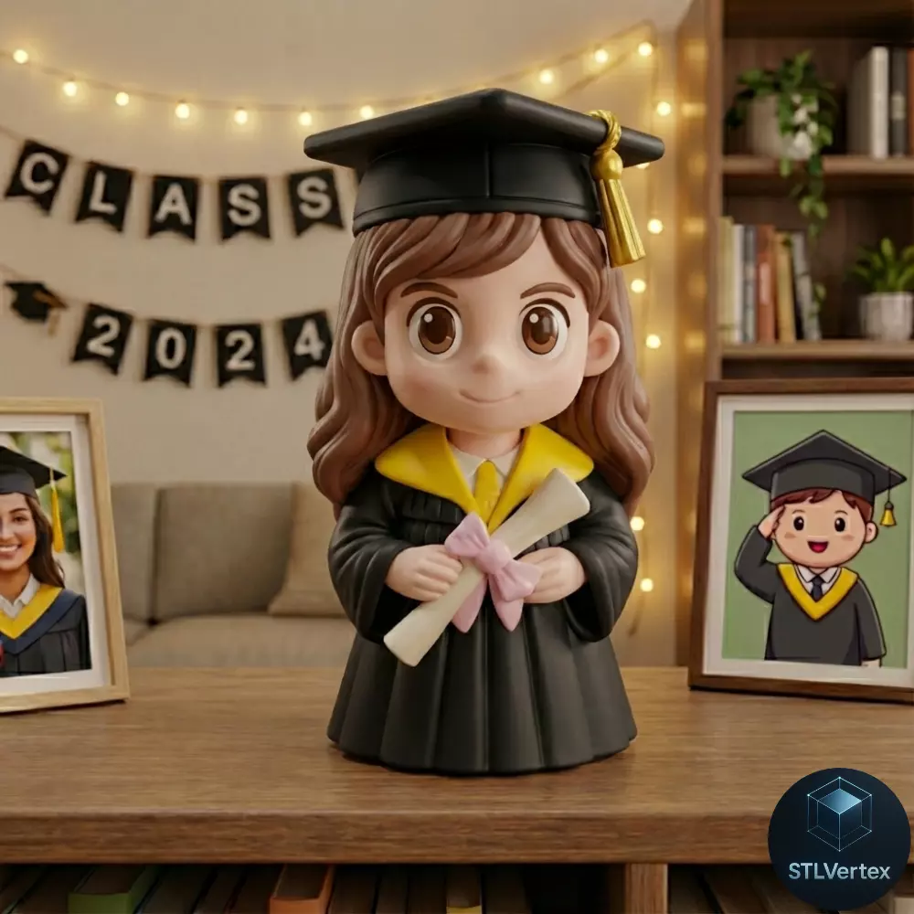Soportes: ANÁLISIS TÉCNICO: Se requieren soportes obligatorios bajo el ala del birrete (mortarboard) y debajo de las manos que sostienen el diploma, ya que presentan voladizos significativos de casi 90°. Se recomienda el uso de soportes de árbol en FDM para facilitar el desprendimiento sin dañar la superficie del cabello.