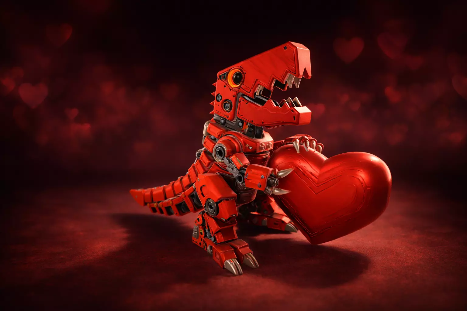robot dinosaur , mechanical dino , valentines gift , heart figurine , sci fi decor , desk decoration , geek gift idea , nerd room decor , dinosaur lover gift , robot figurine , unique home decor , futuristic toy , anniversary gift idea , collectible figure , tech art sculpture , gamer desk decor , cute robot art , gift for him , gift for her , love themed decor