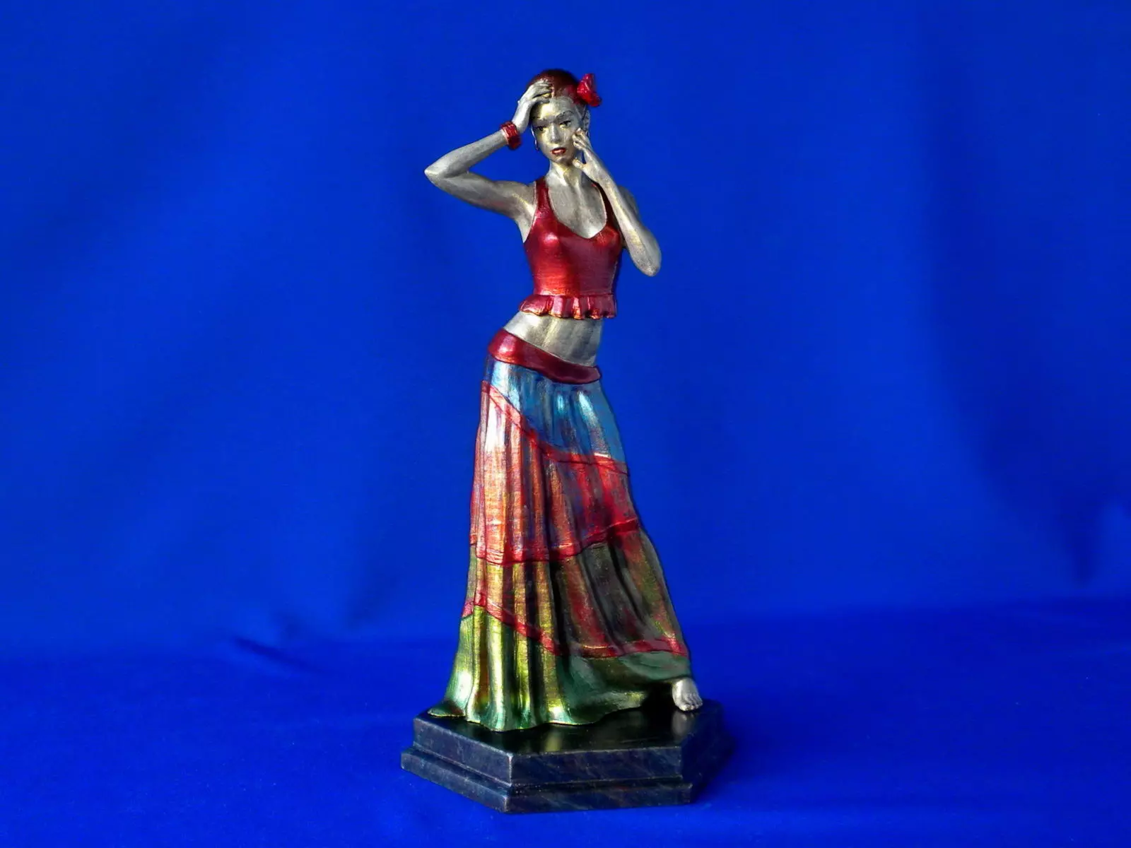The dancer in a gipsy dress froze, but the next moment she will continue her dizzying dance. An elegant gesture of the hands emphasizes the beauty of the pose. The composition is complemented by a stand painted under a decorative stone. Performed in a realistic style, with a lot of small details, the sculpture demonstrates mastery and can decorate any interior.