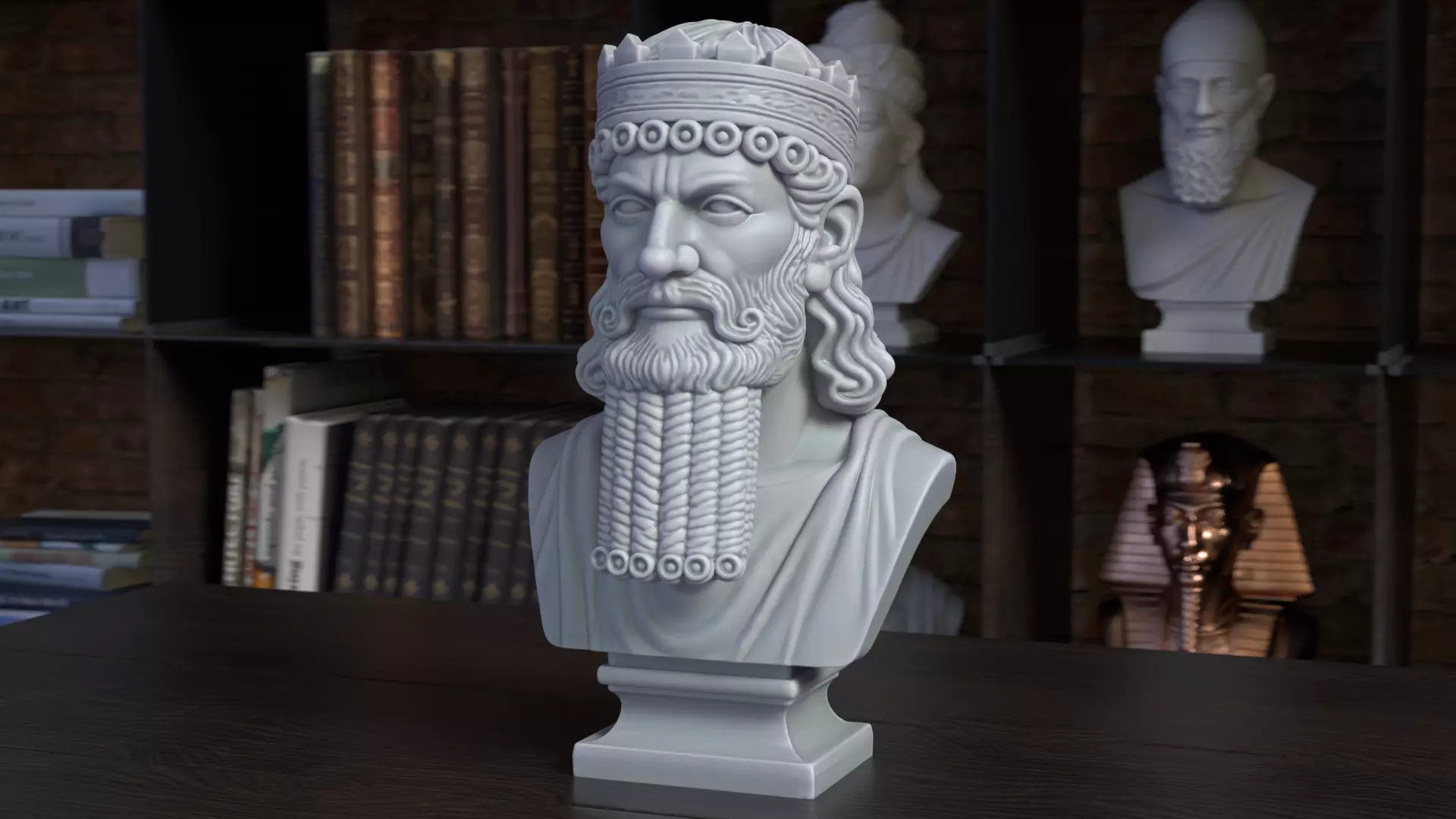 This detailed bust represents Darius I, one of the most prominent rulers of the Achaemenid Empire. The sculpture features his iconic curled beard and a royal headdress, all seamlessly integrated in a uniform marble texture for ease of 3D printing. His attire reflects ancient Persian nobility, designed with elegant drapery and regal posture.