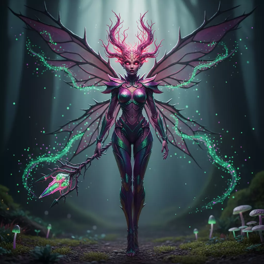 A dark fantasy fairy inspired by enchanted forests, bioluminescent magic, and ancient woodland spirits. She features elegant insect-like wings, glowing arcane energy trails, and organic armor that blends thorned forms with sleek fantasy design. Her antler-like crown and luminous eyes give her a powerful, otherworldly presence, making her ideal as a centerpiece character or boss-level entity.