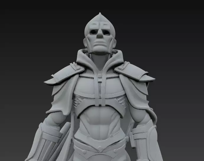 This stylized 3D model depicts a mysterious armored guardian, standing tall in battle-ready posture. Designed with bold armor plates and sharp details, the figure conveys strength, vigilance, and a sense of dark mythological presence.