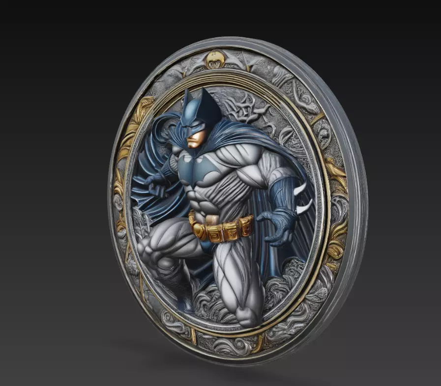 This Dark Vigilante Hero Coin Relief 3D Model features a powerful comic-inspired hero designed as a collectible coin style medallion. The sculptural composition combines superhero aesthetics with intricate ornamental engraving typically found on decorative coins and medallions.