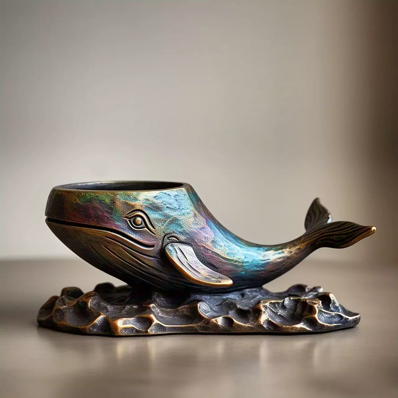 Design ConceptThe decorative whale-shaped pot is an artistic representation of a whale with vibrant, metallic paint finishes that mimic the look of the ocean. Its smooth, curved lines and detailed base evoke the concept of a whale resting on the waves, making it an ideal centerpiece.