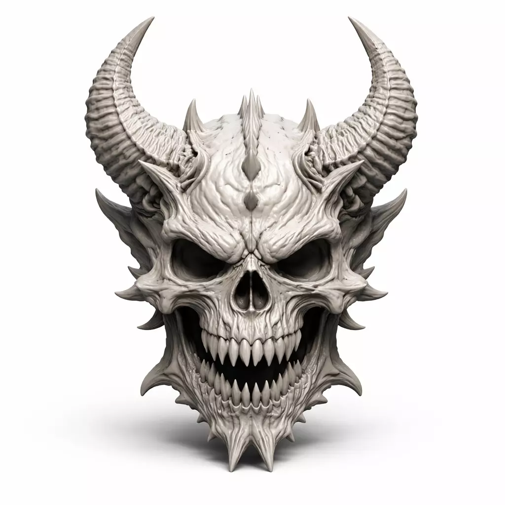 This impressive demonic skull stands out for its aggressive and highly detailed design, featuring curved horns, sharp fangs, and organic textures that give it a dark and powerful appearance. The model is designed to make a strong visual impact once printed, making it ideal for collectors, dark art enthusiasts, themed decor, fantasy or video game projects, and display figures.Its high level of detail makes it perfect for both resin and filament printing, allowing for excellent results with paint and custom finishes. It's an ideal piece as a decorative bust, trophy, diorama element, or desktop display.