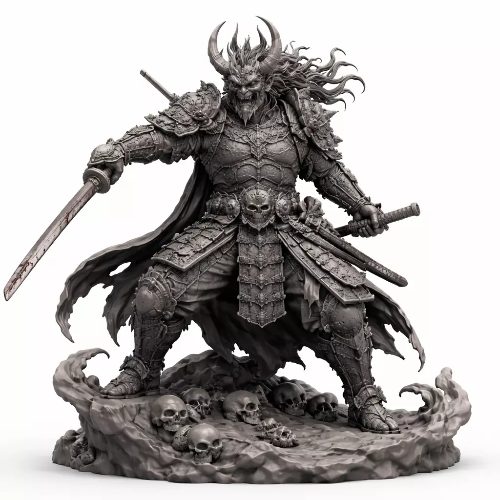 An imposing, samurai-inspired demonic warrior, designed with an extreme level of detail and optimized specifically for high-quality 3D printing. This model features richly ornamented armor, demonic horns, a dynamic cape, and a decorative base adorned with skulls, ideal for creating a striking and collectible piece.The design is intended to achieve excellent definition in resin or filament, with solid volumes, well-defined details, and a powerful stance that will stand out in any display case. Perfect for collectors, wargaming, display figures, art painting, or dark fantasy themed decor.