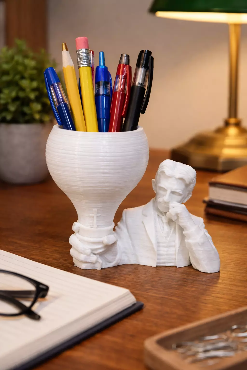 Inspired by Nikola Tesla and wireless light bulb, the figure acts as a solid and balanced holder, making it ideal for desks, shelves, and reading corners.