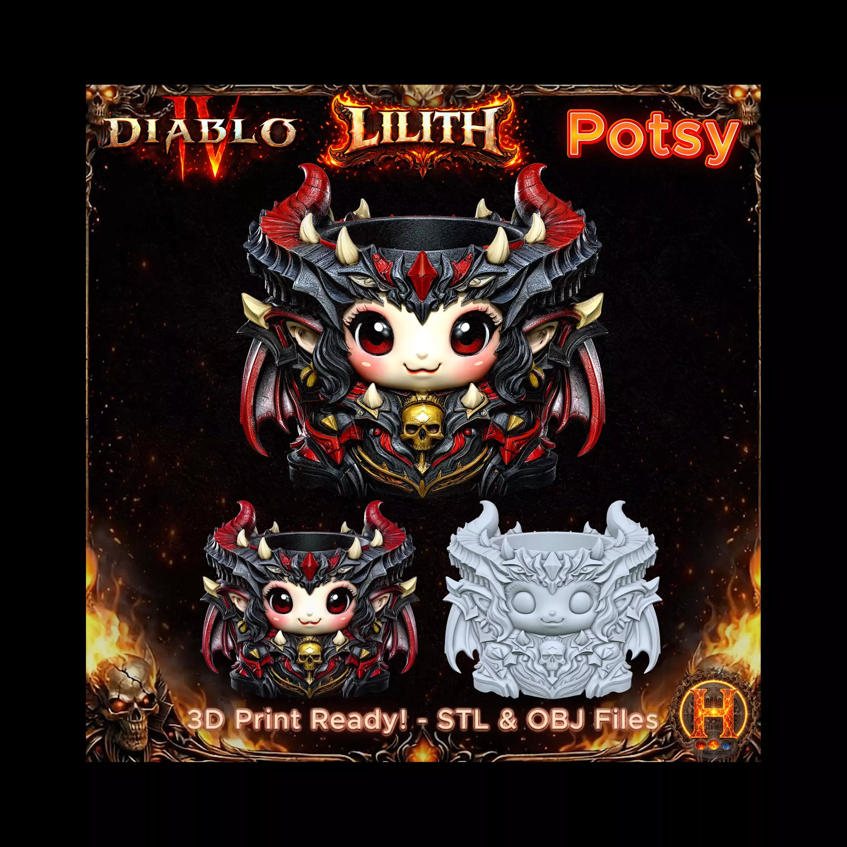 Model SpecificationsModel Name: Diablo 4 - Lilith Category: Dark Fantasy / Chibi / Demon Queen / Collectible BustSeries: PotsyFile Formats: STL, OBJPrint Compatibility: FDM & Resin printersColor Information: Model is delivered uncolored. Hand-painting or colored / multi-material printing is required to achieve a colored result.Potsy is a Helion Artworks design category focused on cute, character-inspired functional objects such as planters and organizers, combining practical use with collectible-level detail and print-ready design.