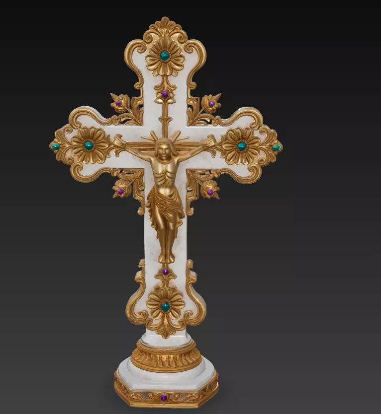 The Divine Majesty Cross – Ornamental Crucifix 3D Model is a breathtaking combination of classical elegance and spiritual artistry. Adorned with gemstone details and golden floral engravings, it reflects divine beauty in a radiant baroque style.