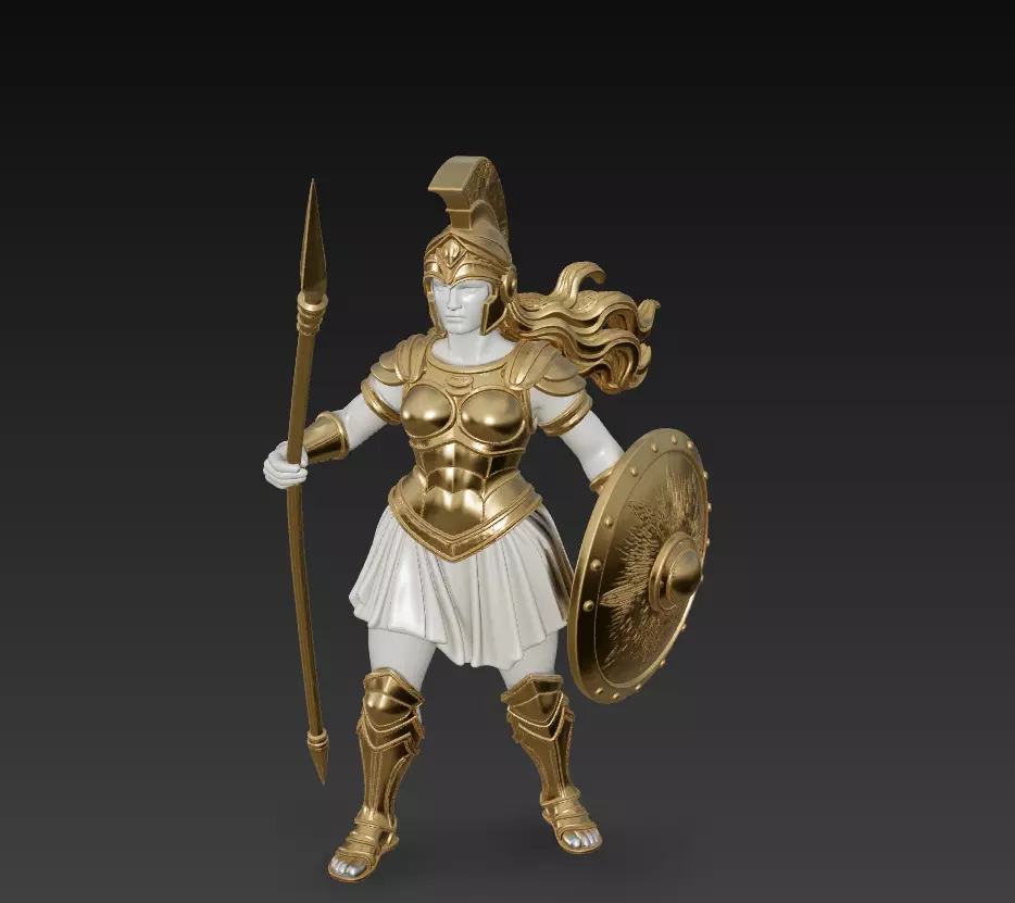 The spear and shield combination, paired with classical warrior attire and polished armor accents, creates a regal monument-style presence — ideal for: