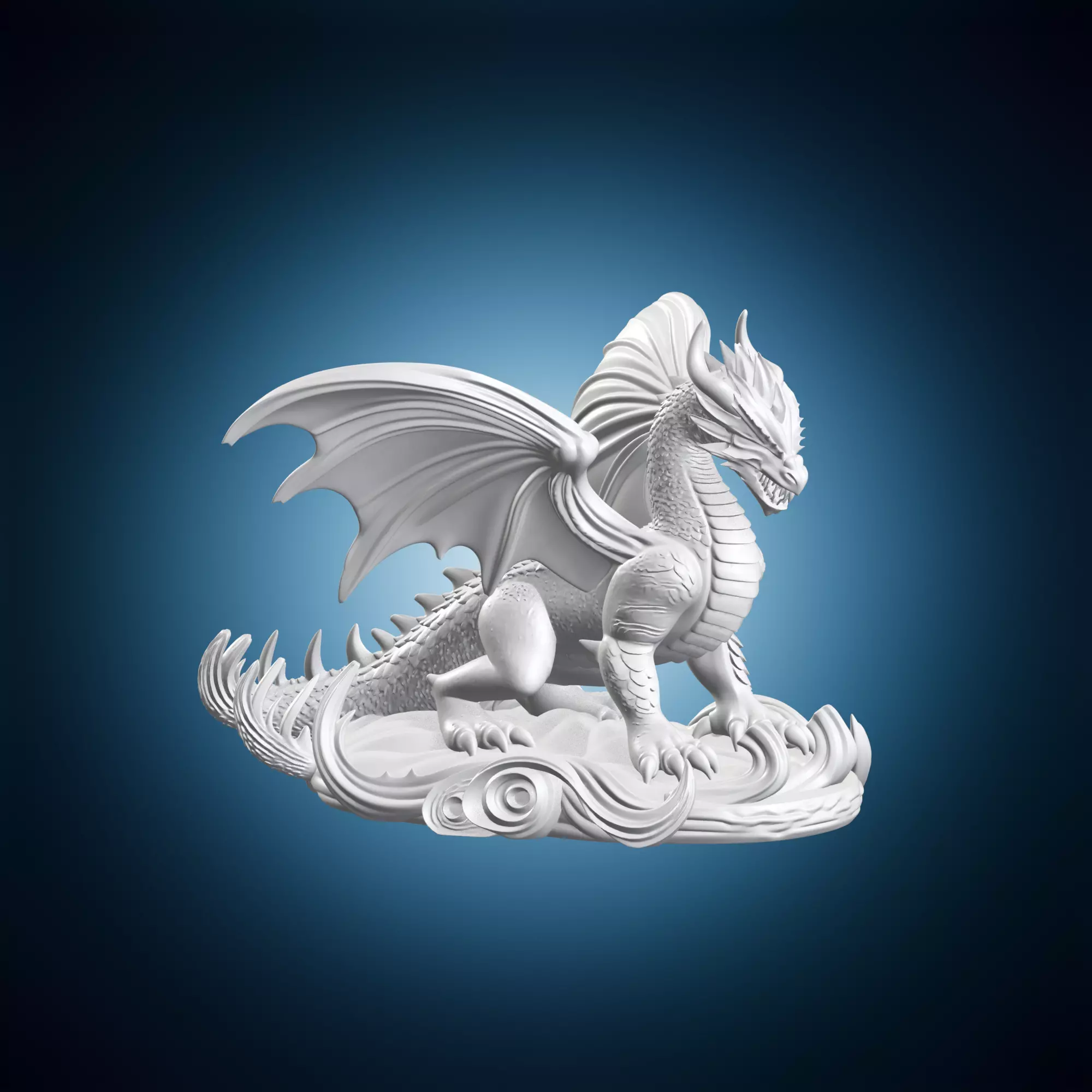 A small dragon sculpture with large wings sitting on a base, made for miniature collectors and enthusiasts of fantasy art. This piece features intricate details and textures, showcasing the artist's skill and imagination. The dragon's wings are spread wide, giving it a powerful and majestic appearance. The miniature is mounted on a base that adds to its overall presence and stability. It is a unique and eye-catching addition to any collection.