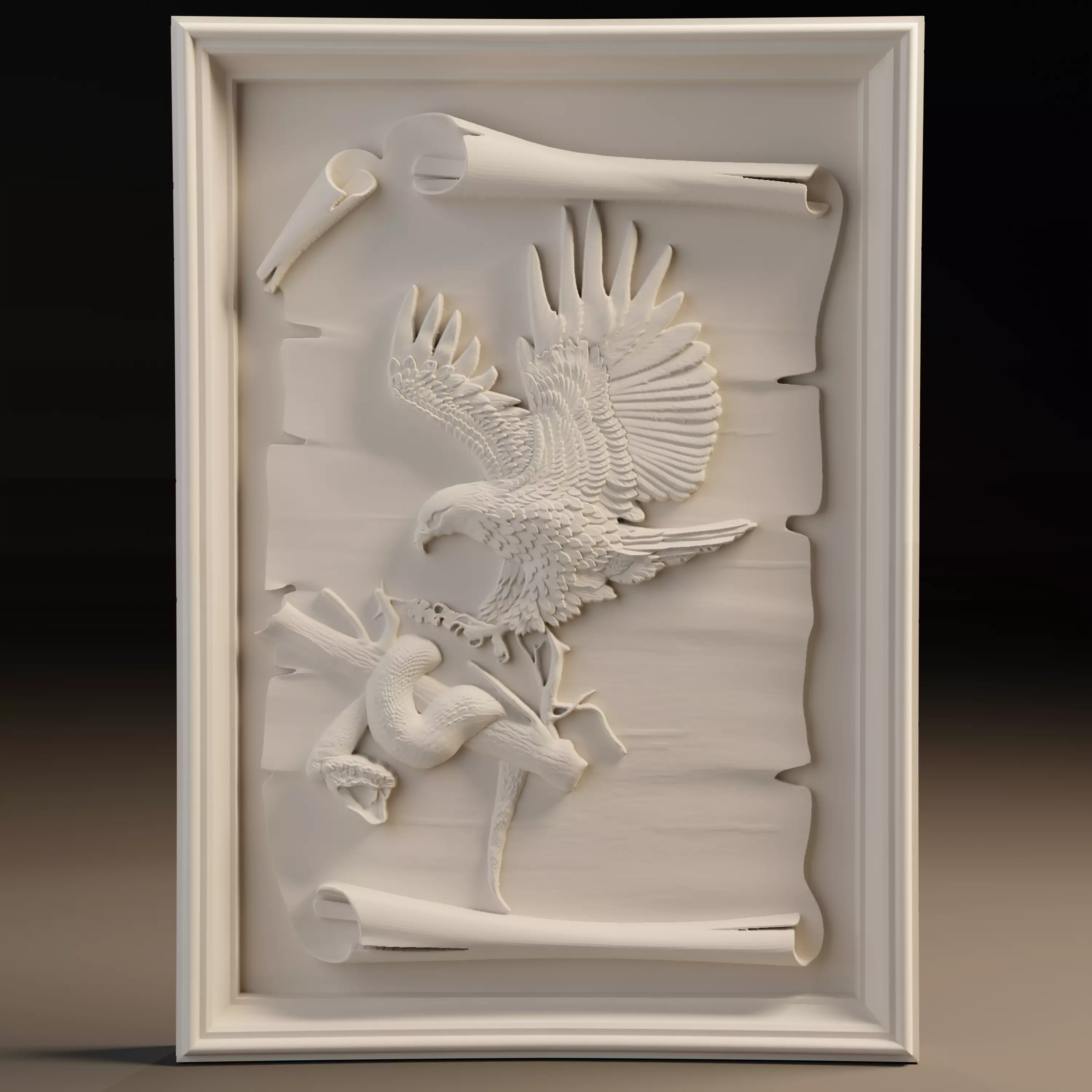 Dynamic wildlife bas relief featuring an eagle in mid-attack grasping a snake, carved on a rustic scroll-style wooden panel and set inside a clean rectangular frame. The scene shows strong motion with detailed feathers, scales, and broken wood textures that give it a dramatic, handcrafted look.