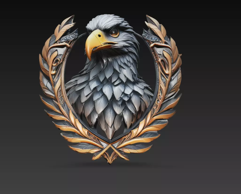 The layered feather details are carefully sculpted to create depth and realism, while the metallic-style ornaments enhance the premium look of the emblem. The balanced composition gives the model a strong identity, making it suitable for logos, badges, and decorative assets.