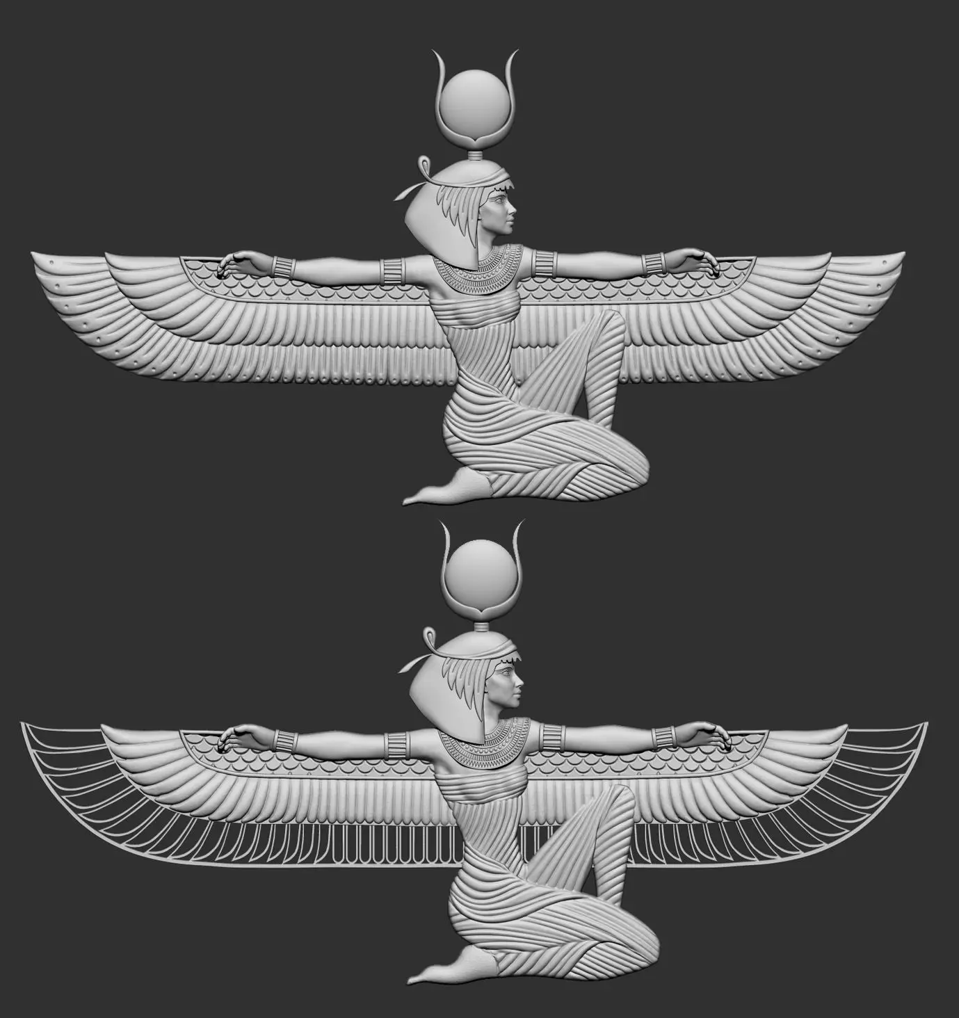 This high-detail 3D relief model of Isis with wings captures the elegance and symmetry of traditional Egyptian temple carvings. The design reflects the classic artistic style seen in monuments such as those at Temple of Philae, where Isis was especially revered.