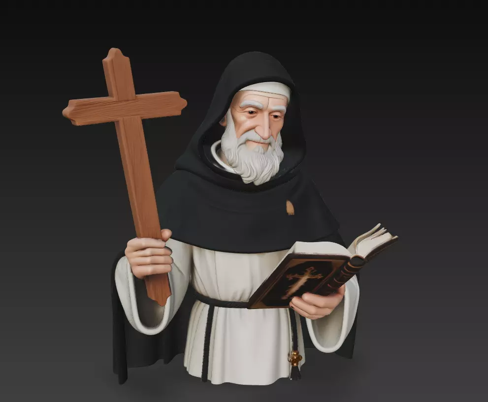 A detailed 3D sculpture of an elderly monk holding a wooden cross and an open holy book.Designed with smooth cloth folds, expressive facial features, and clean silhouette lines, this statue works perfectly for religious artwork, CNC carving, resin printing, dioramas, collectibles, and decorative spiritual projects.