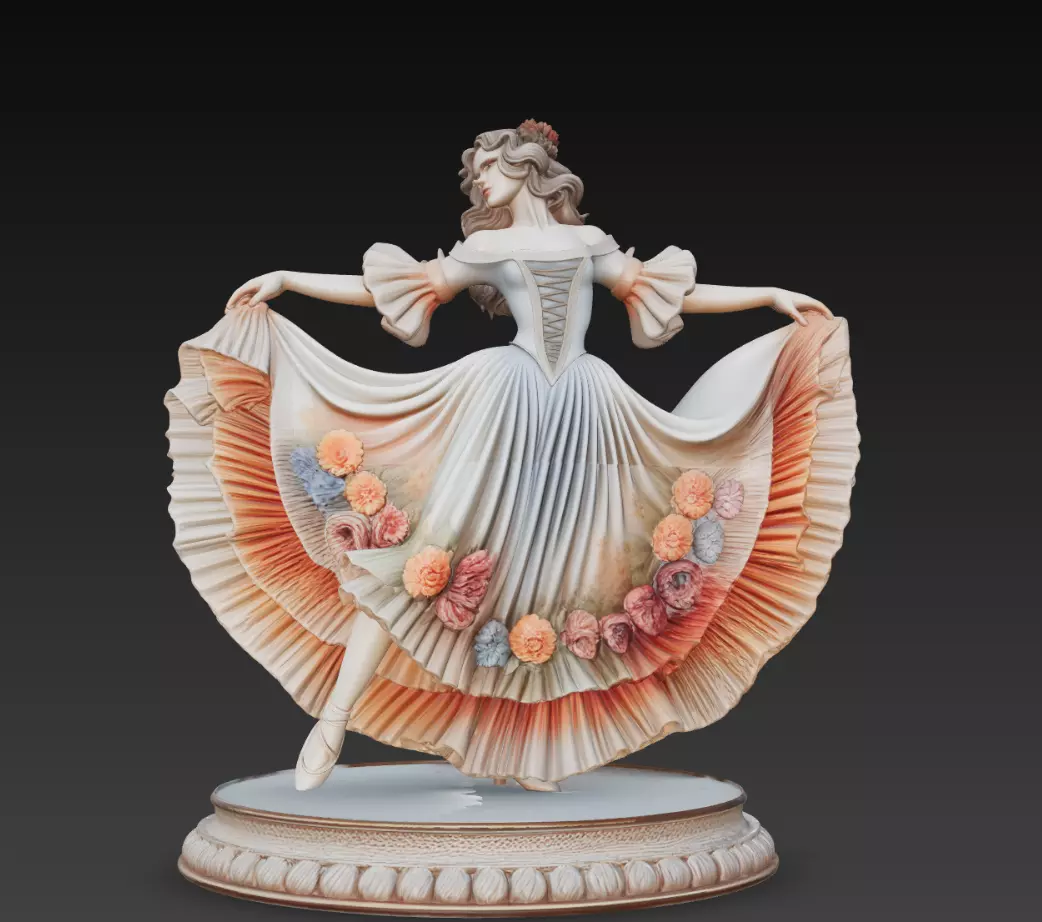 Elegant Floral Porcelain Dancer Figurine is a high-detail 3D model inspired by classic decorative porcelain sculptures. Featuring a graceful female dancer with a wide flowing dress and delicate floral embellishments, this piece blends elegance with ornamental richness.