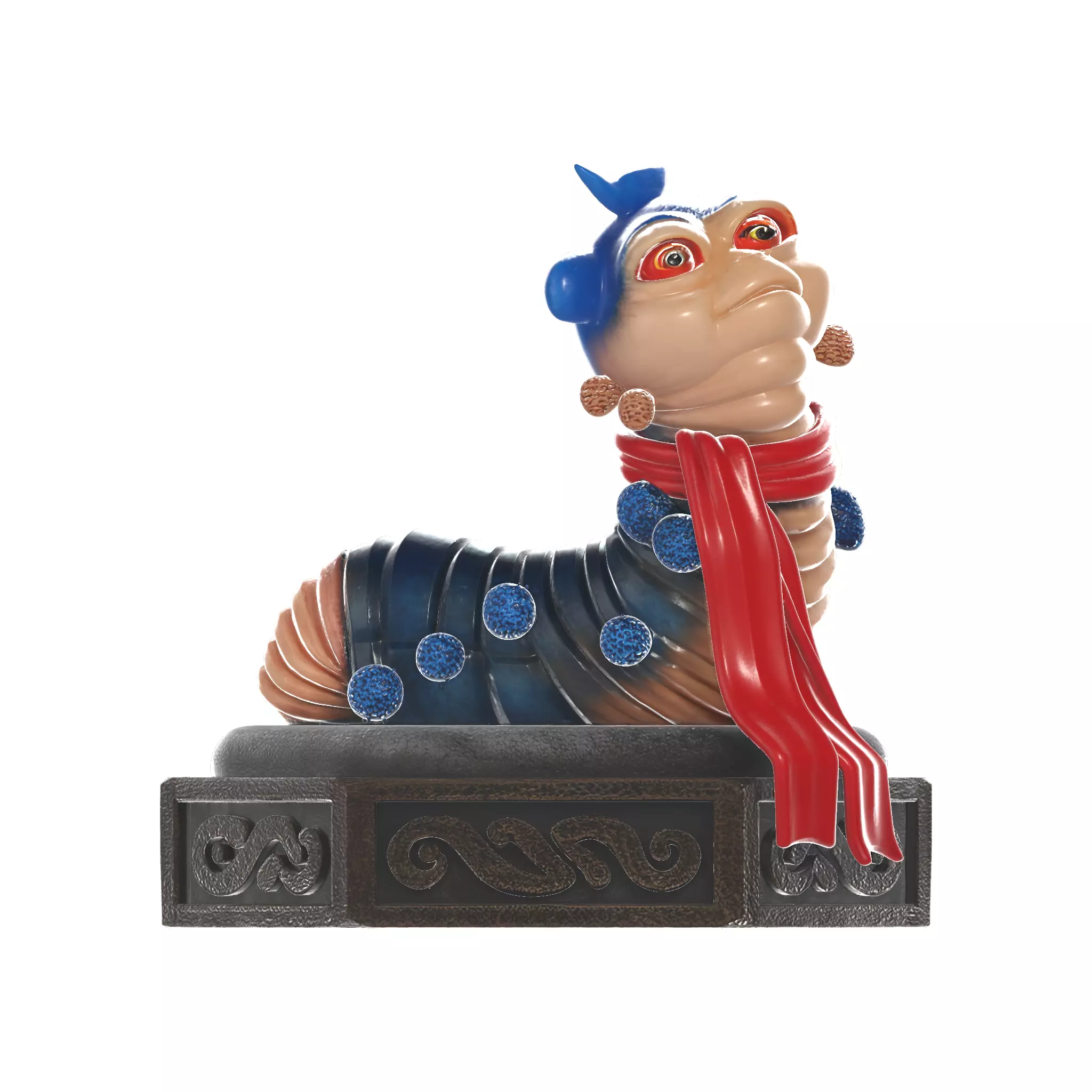 Bring the magic of Jim Henson's Labyrinth to life with this charming Ello Worm figurine! This delightful character, known for his cheerful greeting and helpful (if sometimes confusing) directions, is recreated in stunning detail on an ornate hexagonal base.The model captures the worm's distinctive features perfectly - his expressive red eyes, friendly demeanor, and that unforgettable red scarf flowing gracefully from his segmented blue body. The intricate base features traditional carved patterns that complement the whimsical nature of this beloved Labyrinth character.Perfect for fans of the classic 1986 fantasy film, collectors of movie memorabilia, or anyone who appreciates the artistry of Jim Henson's creature design. This figurine makes an excellent display piece for desks, shelves, or dedicated movie collections.Whether you're a longtime Labyrinth enthusiast or discovering the magic for the first time, this Ello Worm model brings a touch of fantasy and nostalgia to any space. The detailed craftsmanship ensures this piece will be a conversation starter and treasured collectible