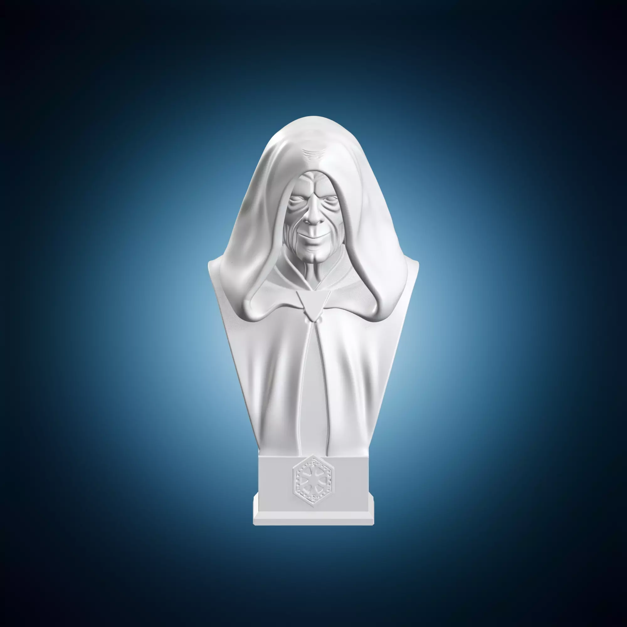 A life-size bust of Emperor Palpatine from the Star Wars franchise, sculpted in fine detail and crafted to resemble a work of art. Perfect for fans of the series or collectors of rare sculptures. The model is detailed with intricate textures and patterns, capturing the complexity of the character's appearance. Available for use in various applications, such as video games, movies, or home decor.
