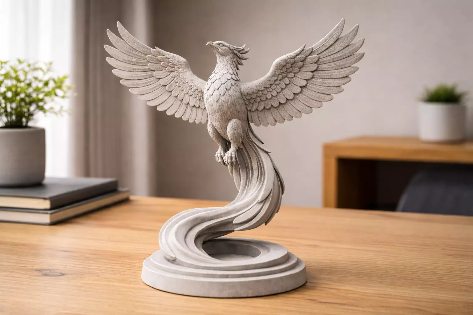 The phoenix rises upward with fully extended wings forming a smooth arc, creating a sense of calm strength and noble elegance. Layered feather structures and balanced proportions give the sculpture a clean and harmonious visual appearance.
