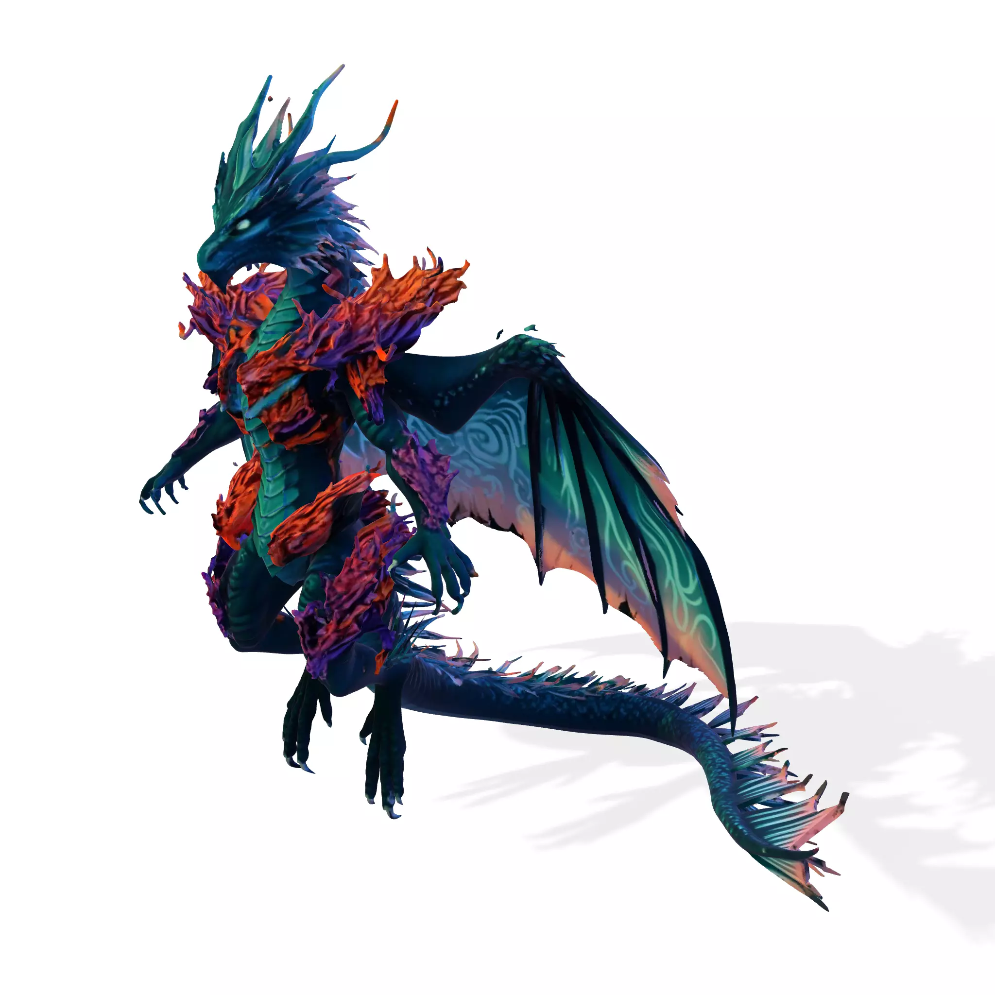 What sets this character apart is the fusion of elemental aesthetics: fiery, coral-like growths emerge organically along its body in vivid tones of orange and red, evoking both volcanic energy and marine life. This interplay between cool and warm elements gives the dragon a unique identity that blends fantasy with subtle natural inspiration.