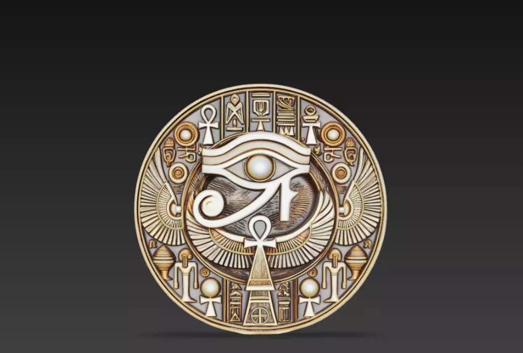 The design captures the mystical and protective symbolism associated with the Eye of Horus while maintaining a balanced coin-style aesthetic inspired by ceremonial medallions.