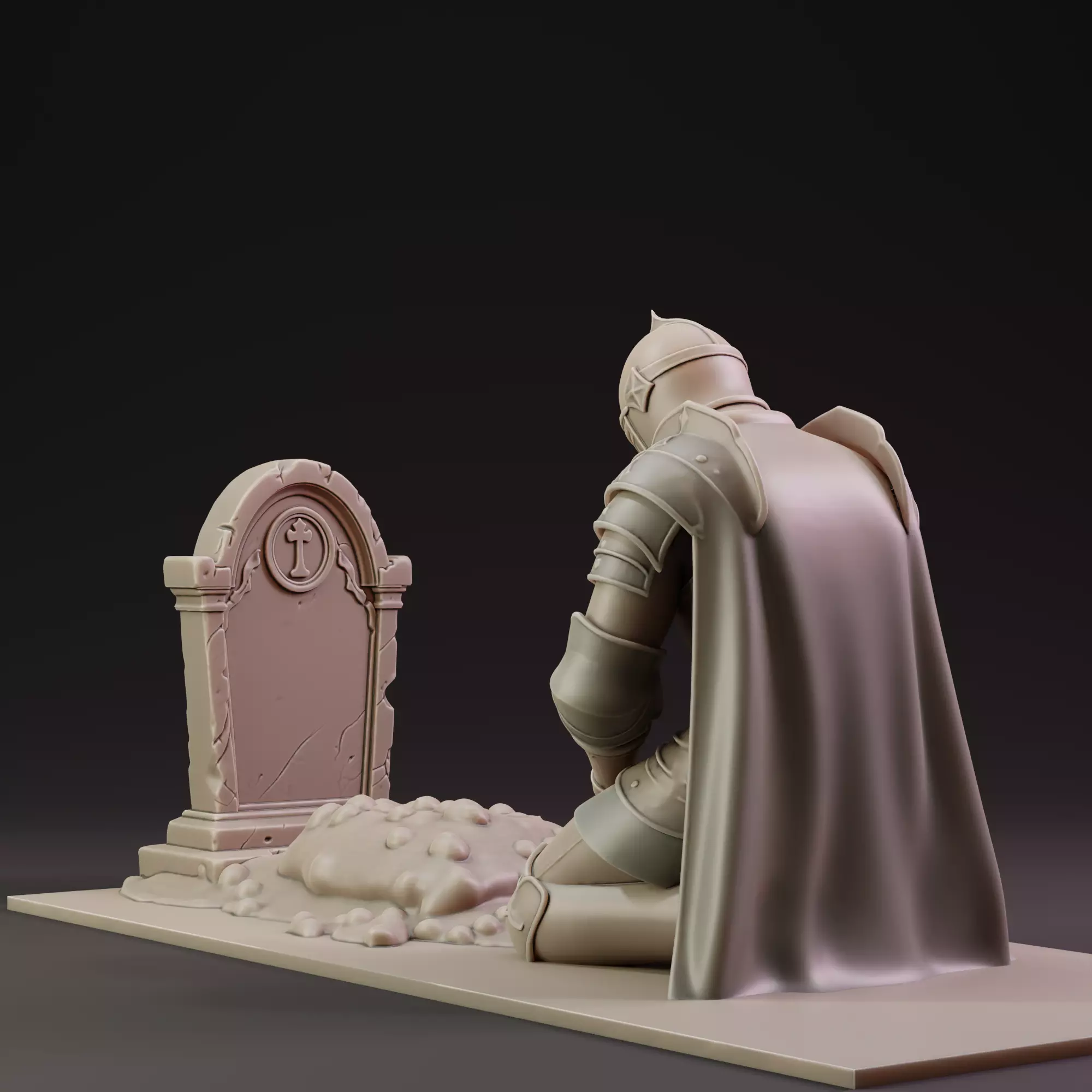 Yet the knight kneels before a grave too small for a warrior.