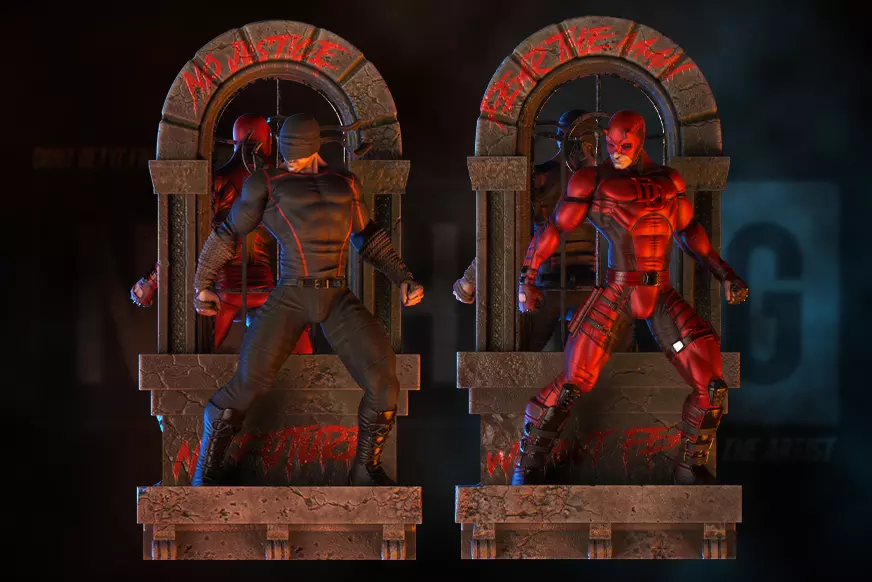 Hola! Este es mi fan art de DareDevil, basado mayormente en la versión de la serie de netflix para su pasado de vigilante y para su traje definitivo me base en el comic pero lo modernizé un poco. Esculpido enteramente en zbrush y con la atención puesta en cada detalle y textura, Este modelo está listo para imprimirse. La escultura esta dividida en partes y con encastres perfectos para facilitar su impresión y su pintura. Asimismo incluye una versión de cuerpo completo sin base. La base también se encuentra separada en partes y en una sola pieza.