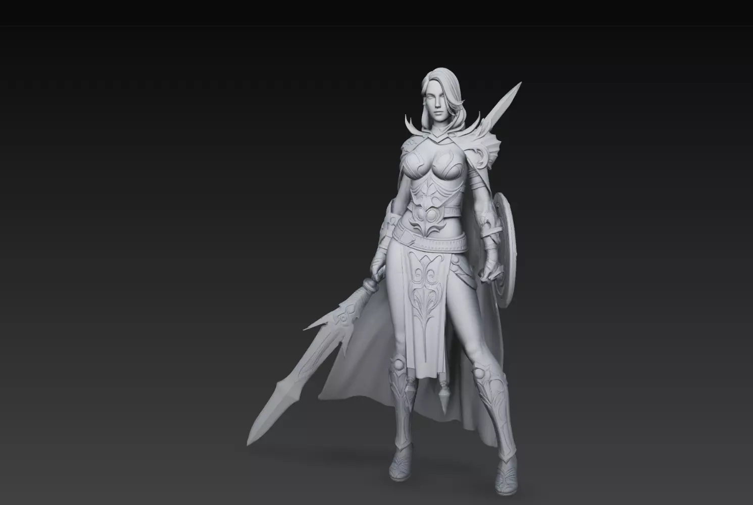 The design showcases detailed armor, stylized anatomy, flowing hair, and carefully crafted accessories. The combination of sharp armor elements, smooth surfaces, and strong proportions creates a visually striking character suitable for both display and production.