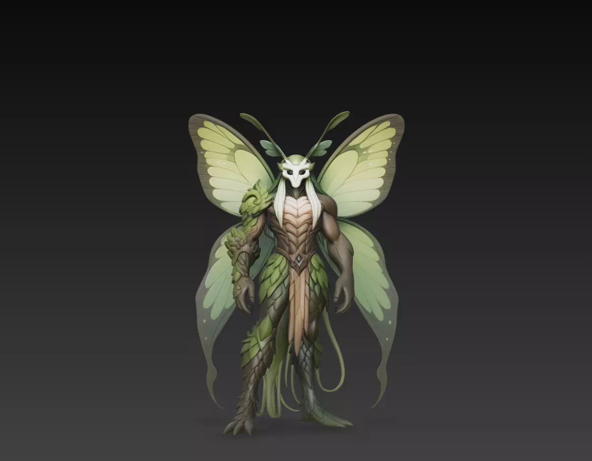 The character combines humanoid anatomy with moth-like elements, including large detailed wings, antennae, and layered organic textures. The mask-like facial structure adds a mysterious and slightly eerie presence, making the creature stand out as a guardian or ancient forest entity.