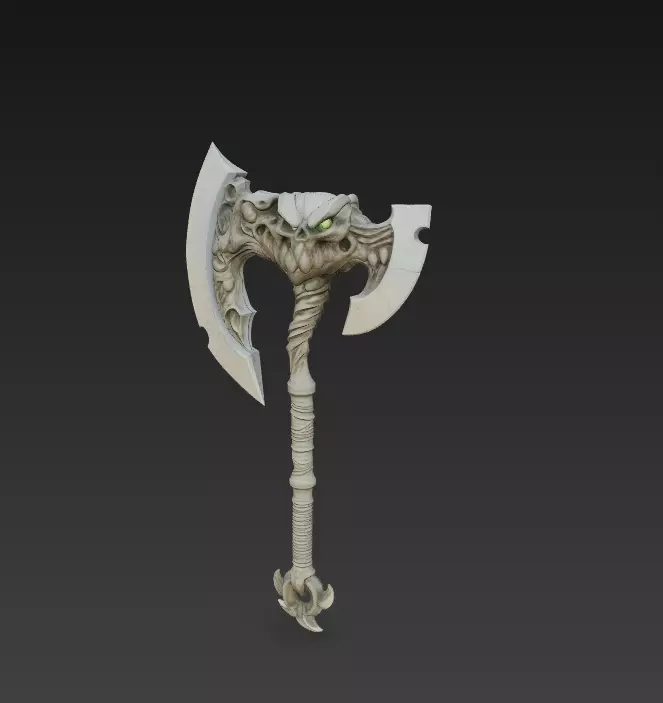 The axe features a double-edged blade with organic curves and skull details, giving it a truly intimidating look for fantasy games, RPG environments, or collectible display models.Its optimized mesh and clean topology make it easy to integrate into CGI scenes or adapt for 3D printing.