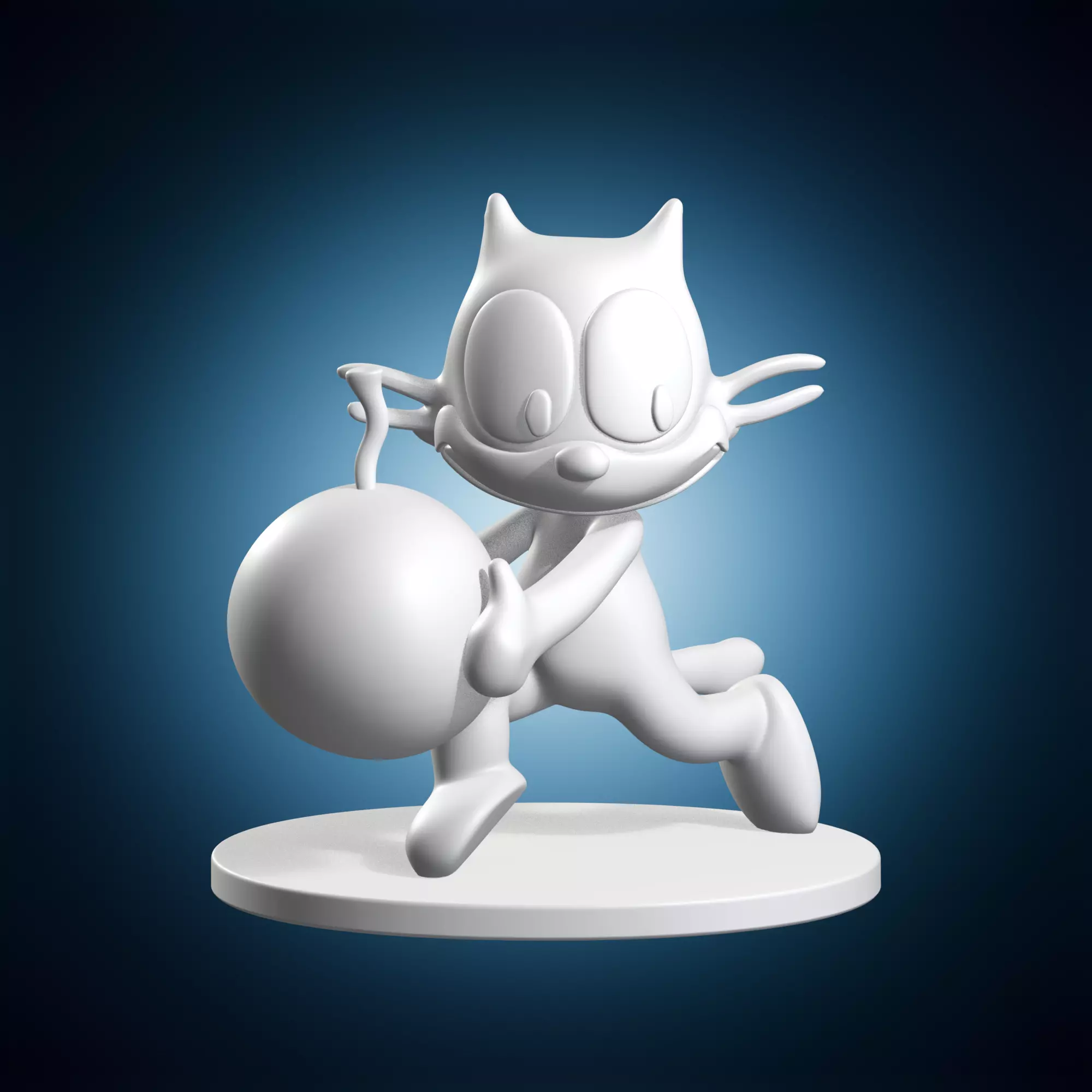 3D model of Felix the cat holding a bomb, a cartoon character and object. The model can be used in various animation projects or as a decorative item for a cartoon-themed room. The model is made up of multiple parts, including Felix's body, arms, and legs, as well as the bomb itself. The model has a simple shape and smooth surfaces, making it suitable for beginners and experienced 3D artists alike.