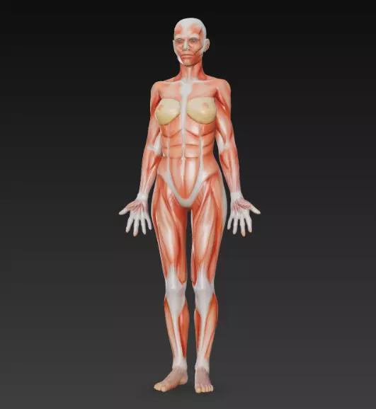 3D model descriptionThe female muscular system is similar to the male system, with three types of muscle tissue—skeletal, smooth, and cardiac—all responsible for movement, posture, and internal functions. However, differences in body composition and muscle fiber types exist, with female muscle tissue on average having higher fatigue resistance and faster recovery, while male muscle tends to have higher maximum power output. Estrogen levels also influence female muscle development and function, as do hormonal changes during pregnancy.