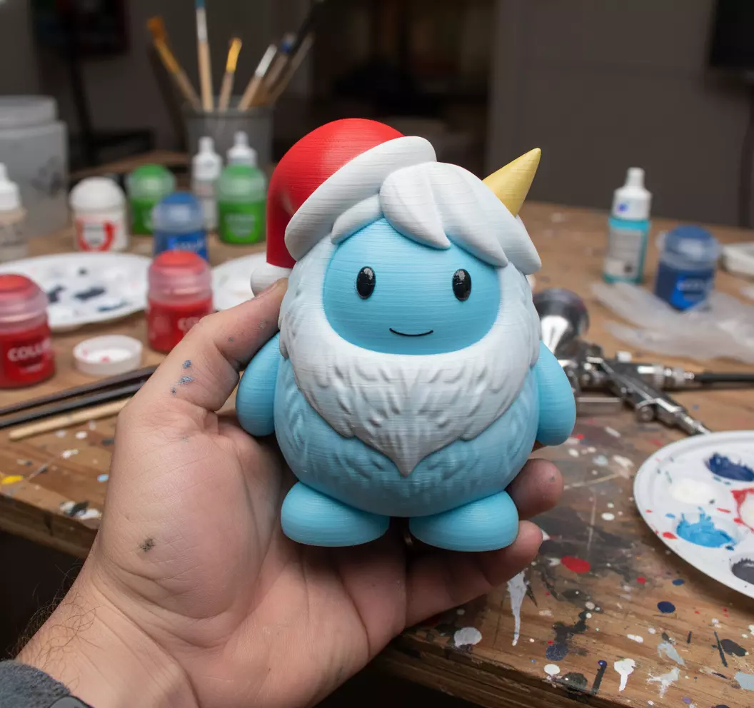 - Painting Tip: To match the render, use a soft baby blue for the skin and a clean white for the fur/beard. Use a bright yellow for the horn to make it stand out, and classic festive red for the hat. A dot of gloss varnish on the eyes will bring him to life!