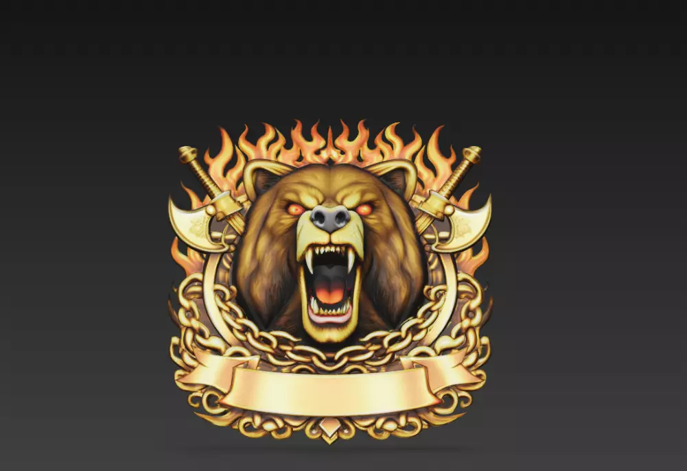 This Flaming Bear Warrior Crest 3D Model features a roaring bear head surrounded by blazing flames, crossed battle axes, heavy chains, and ornate heraldic detailing.