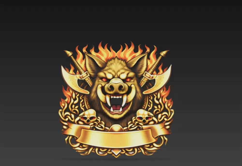 This Flaming War Boar Clan Crest 3D Model features a roaring wild boar head surrounded by blazing flames, crossed battle axes, skull details, and ornate medieval framing.