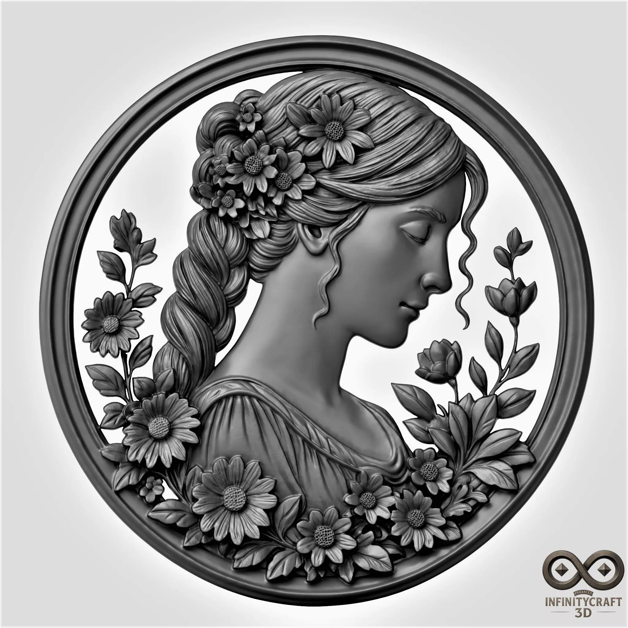 This elegant bas-relief features a graceful woman surrounded by intricate floral elements, perfect for adding a touch of classic romance to your space. Designed with clean details and optimized geometry, it's ideal for CNC carving and high-quality 3D printing. Suitable for wall decor, gift-making, and artistic projects.