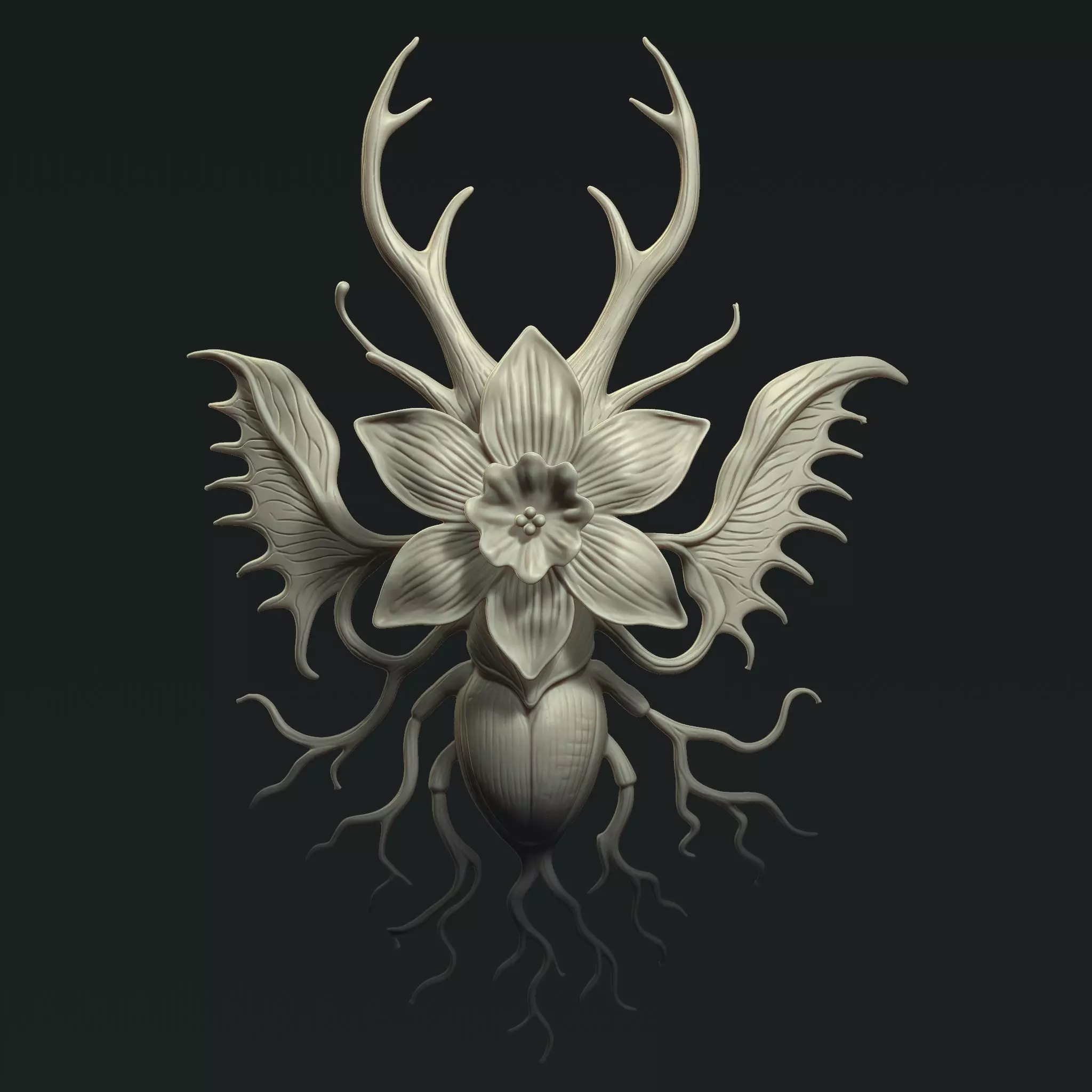 At its core lies a blooming floral form, evolving into an insect-like body with winged extensions, antler-inspired horns, and root-like tendrils—symbolizing growth, transformation, and ancient guardianship.
